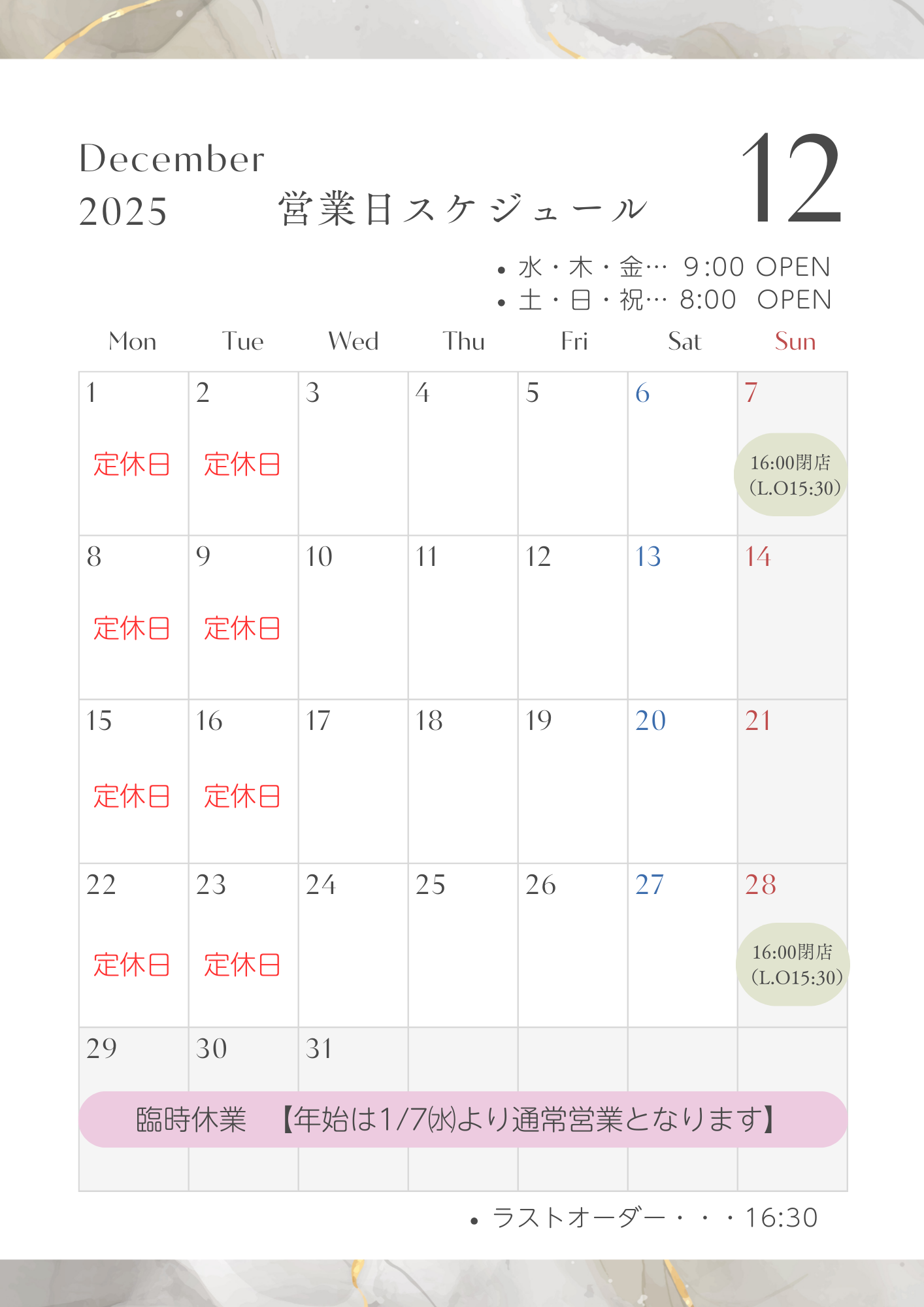 12月~3月の平日は9時~17時、土日祝は8時~17時となります。 また、12月7日㈰と28日㈰は16時閉店(ラストオーダー15時30分)とさせていただきます。 今年もあとわずかとなりましたが、皆様のお越しをお待ちしております。 尚、新年は1月7日㈬から通常営業となります。 シェアする