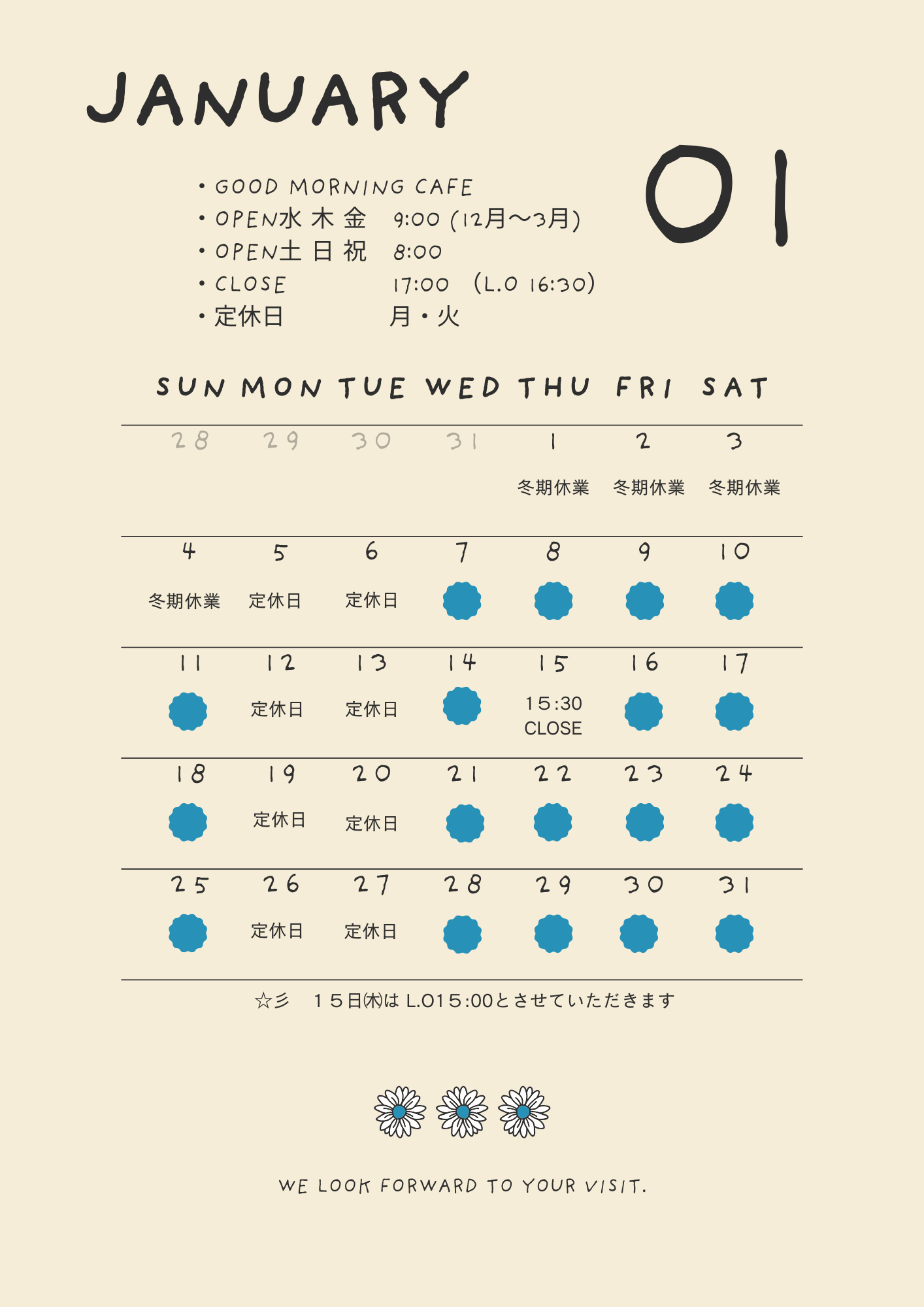 旧年中はご愛顧いただき誠にありがとうございました。 本年もホッとできる空間をご提供できるようスタッフ一同頑張ってまいります。 皆様のお越しを心よりお待ちしております。 尚、1月15日(木)は都合により15時30分閉店(L.O15時)とさせていただきます。シェアする