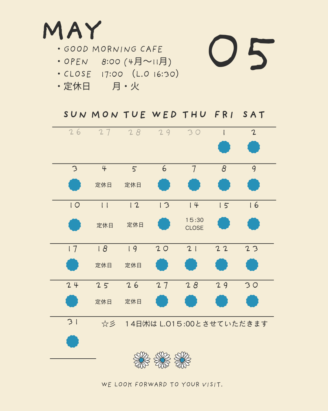 五月は月・火の定休日のみお休みさせていただきます。 G.Wも祝日関係なく、月・火休みとなります。 また、14日㈭は15時30分閉店(L.O15時)とさせていただきます。 気持ち気候の時期となりました。 皆さまのお越しをお待ちしております。シェアする
